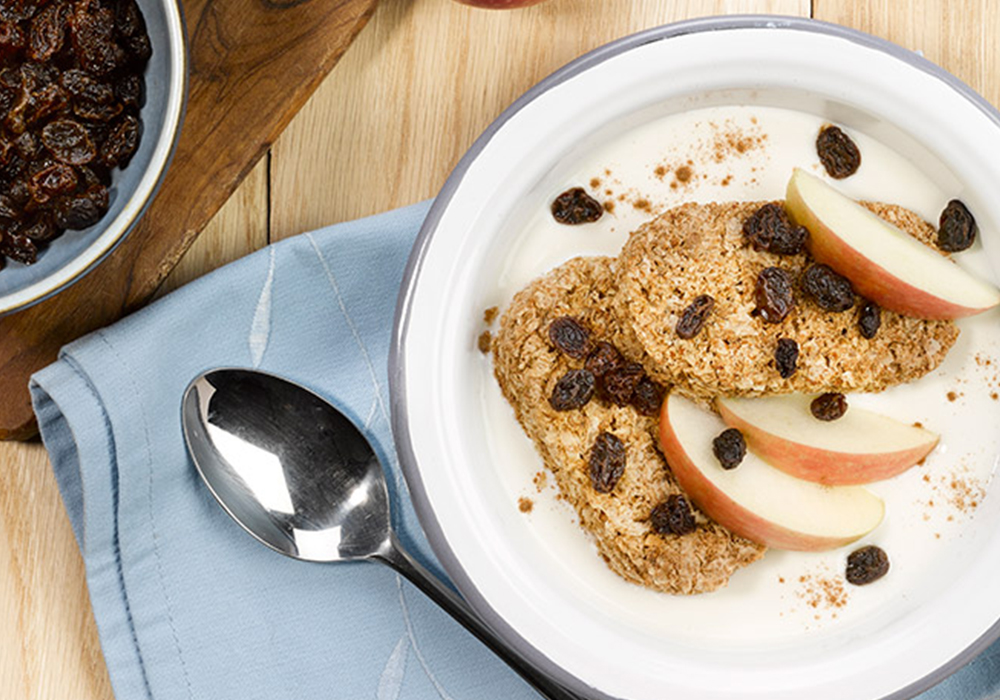 • Βάλτε δύο Weetabix σε ένα μπολ, βάλτε από το μήλο και πασπαλίστε με τις σταφίδες